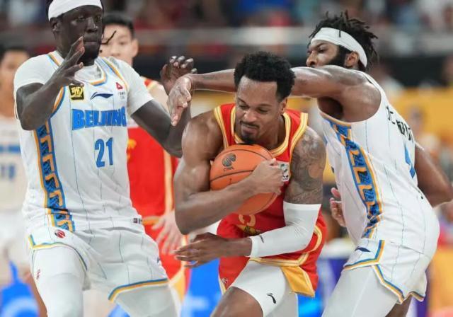 在2024-2025赛季CBA总决赛第五场比赛中,广厦队球员布朗与北京队球员杰曼和奥莫特在比赛中拼抢