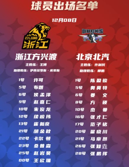 北京:奥莫特21分5板3助、张知垚14分6板2助、翟晓川14分3板、杰曼10分、陈盈骏9分2板6助、范子铭6分7板4助2断。